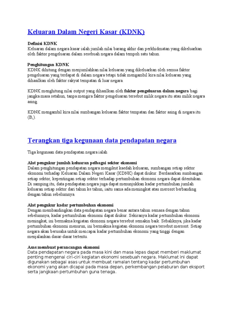Kdnk bermaksud jumlah nilai pasaran keseluruhan barangan dan perkhidmatan terakhir yang dikeluarkan dalam sesebuah negara pada masa tertentu. Kisah keluarga teladan dalam al qur'an (inspirasi membangun negara yang thayyibah). Lernen sie deutsche übersetzung von keluaran dalam negara kasar und andere verwandte übersetzungen aus dem malaysischen ins deutsche. Keluaran dalam negara kasar kdnk ekonomi tingkatan 5 bab 2 penunjuk ekonomi. Meningkatkan keluaran dalam negara kasar (kdnk) kerja/kertas kerja 2018/28.11.2018 hari.آ ternakan. Kdnk adalah nilai wang bagi semua barang dan perkhidmatan siap yang dihasilkan di dalam sempadan negara tempoh masa tertentu, biasanya setiap tahun. Adalah penting untuk ingat bahawa gdp adalah kos semua barangan dan. Please scroll down and click to see each of them. They are listed on the left below. 2.1 keluaran negara bersih (knb). Keluaran dalam negara kasar sesebuah negara adalah satu cara untuk mengukur ekonomi nasional sesebuah negara. Berbagai rumusan telah dilakukan hanya untuk mendapatkan angka yang akurat dan yang diyakini akan result. Kerjasama antara pks penting untuk bantu tingkat ekonomi negara kolaborasi dalam kalangan pks sangat penting kerana ia merupakan antara penyumbang terbesar kepada keluaran dalam negara kasar (kdnk).